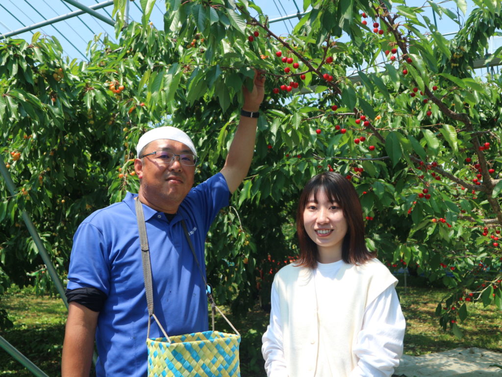 菊地果樹園の菊地信一さん(写真左)にお話を伺いました。5月下旬の「さくらんぼ」から「桃」の時期までの菊地果樹園を見させていただきました。