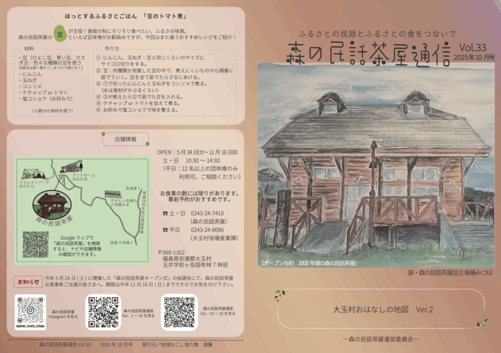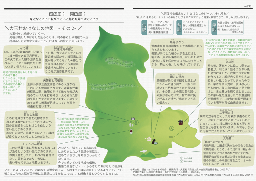 森の民話茶屋通信Vol.33 森の民話茶屋通信 10月号/Vol.33 大玉村おはなしの地図 Ver.2先祖が残したおはなしを辿ることは、村の暮らしや現在の大玉村の在り方を辿ること。おはなしの旅に出ましょう! 12/03/2025 投稿先 おおたまマップ, 森の民話茶屋, 森の民話茶屋通信 地域おこし協力隊 地域の伝説 大玉村 村巡り 森の民話茶屋 森の民話茶屋通信 民話 民話マップ 福島県 福島県北 移住者 郷土料理 ← 過去の投稿へ 次の投稿へ → コメントを残す コメントをキャンセルメールアドレスが公開されることはありません。 ※ が付いている欄は必須項目ですコメント ※ 名前 ※ メール ※ サイト 次回のコメントで使用するためブラウザーに自分の名前、メールアドレス、サイトを保存する。 Δ